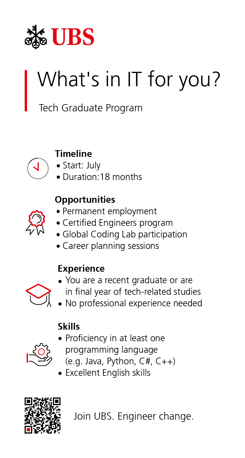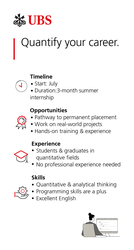 At UBS, students can gain real experience through paid 6-12 month internships across various departments, including Tech Internships, or a 3-month Quantitative Summer Internship in Risk Modelling. Graduates can continue their journey with our 18-month Tech Graduate Program.